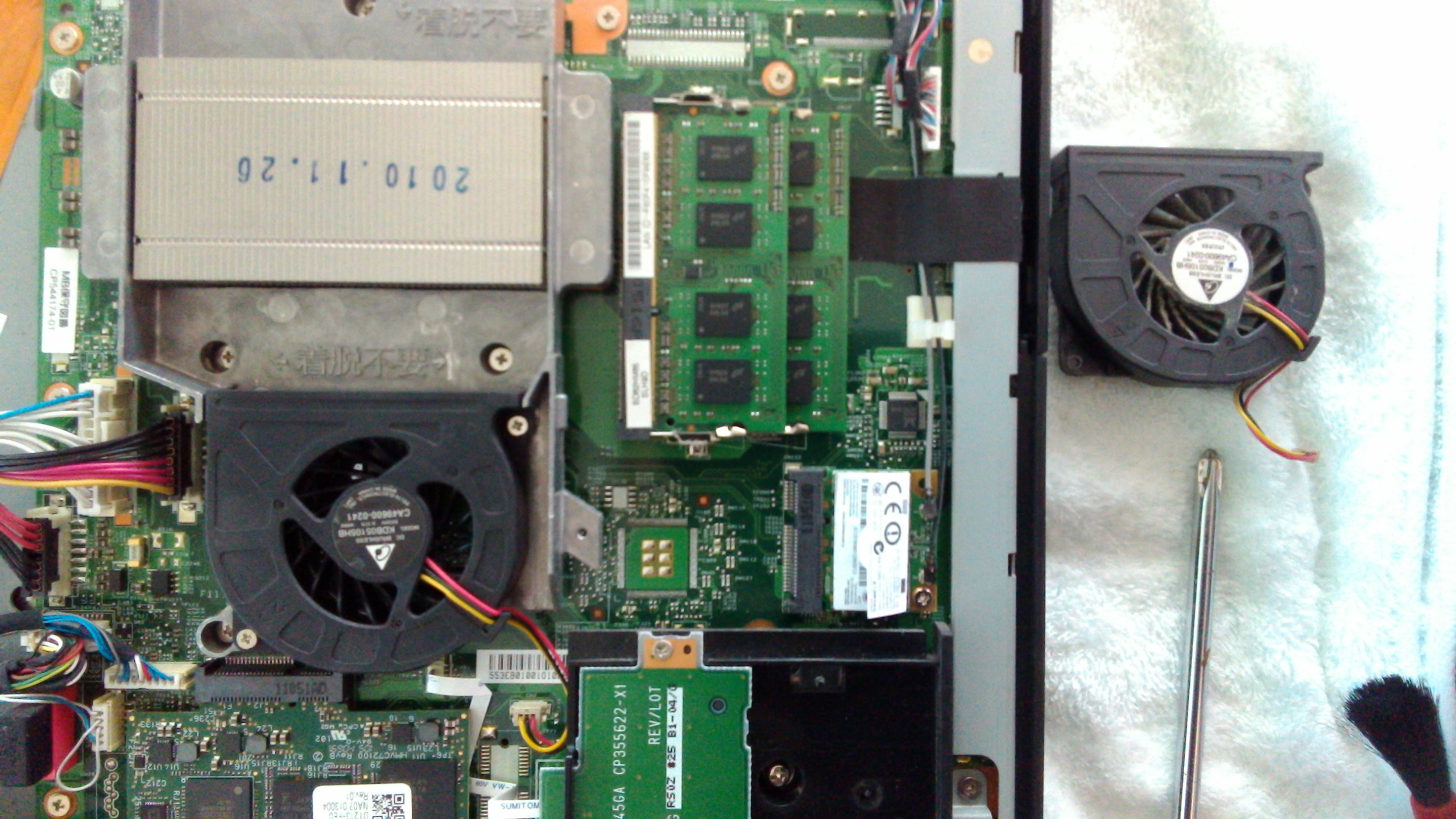 内部の金属カバーを外した状態で通電をすると右側ファンからガラガラと異音がするのを確認できました。このESPRIMO FH98/CMには2つのファンがあり、もう片方はパナソニック電工製のナノイー発生ユニット用ファンが取り付けられていますが、こちらは正常に動作しており問題ありませんでした。